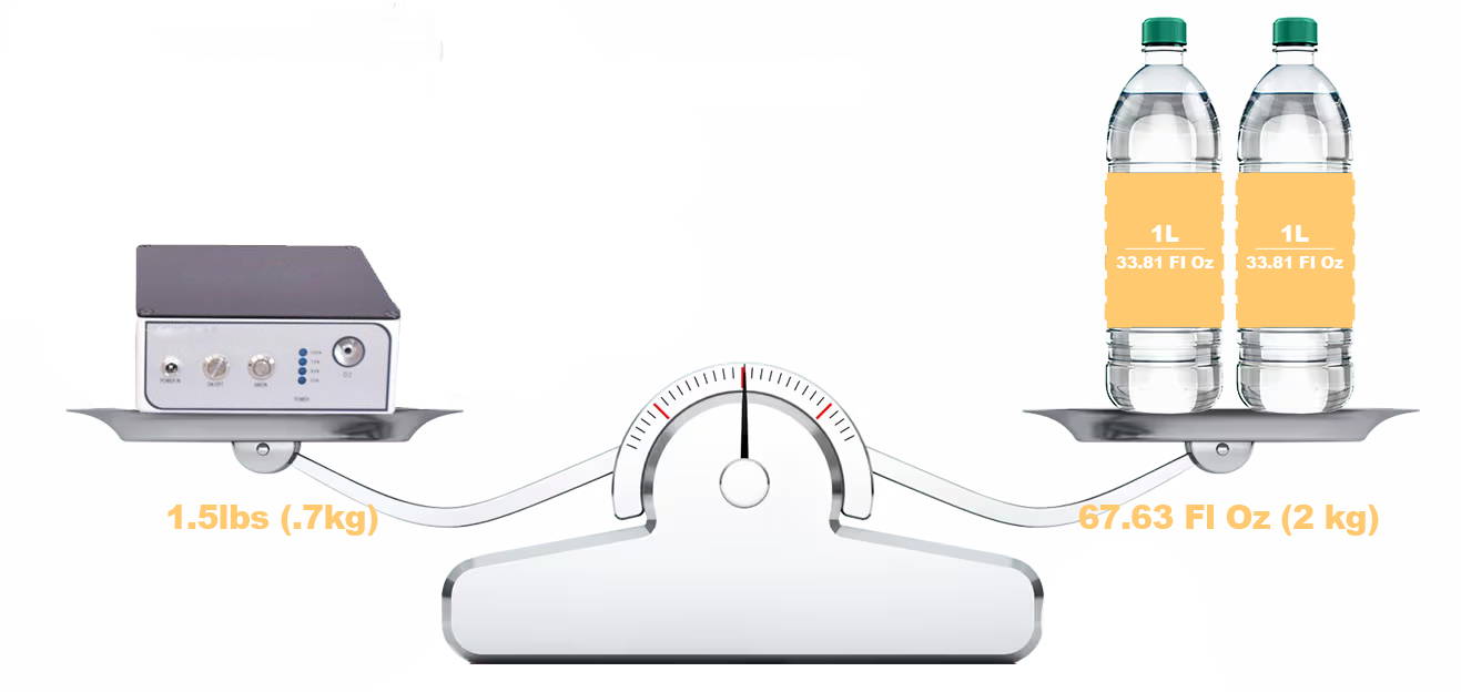 Weighing a mere 1.5 lbs (.7kg) and boasting compact dimensions of 5.5" x 5.5" x 2.75", this portable oxygen concentrator is effortlessly portable and perfect for on-the-go use. Get rid of heavy bulky equipment, and take this portable oxygen concentrator instead.